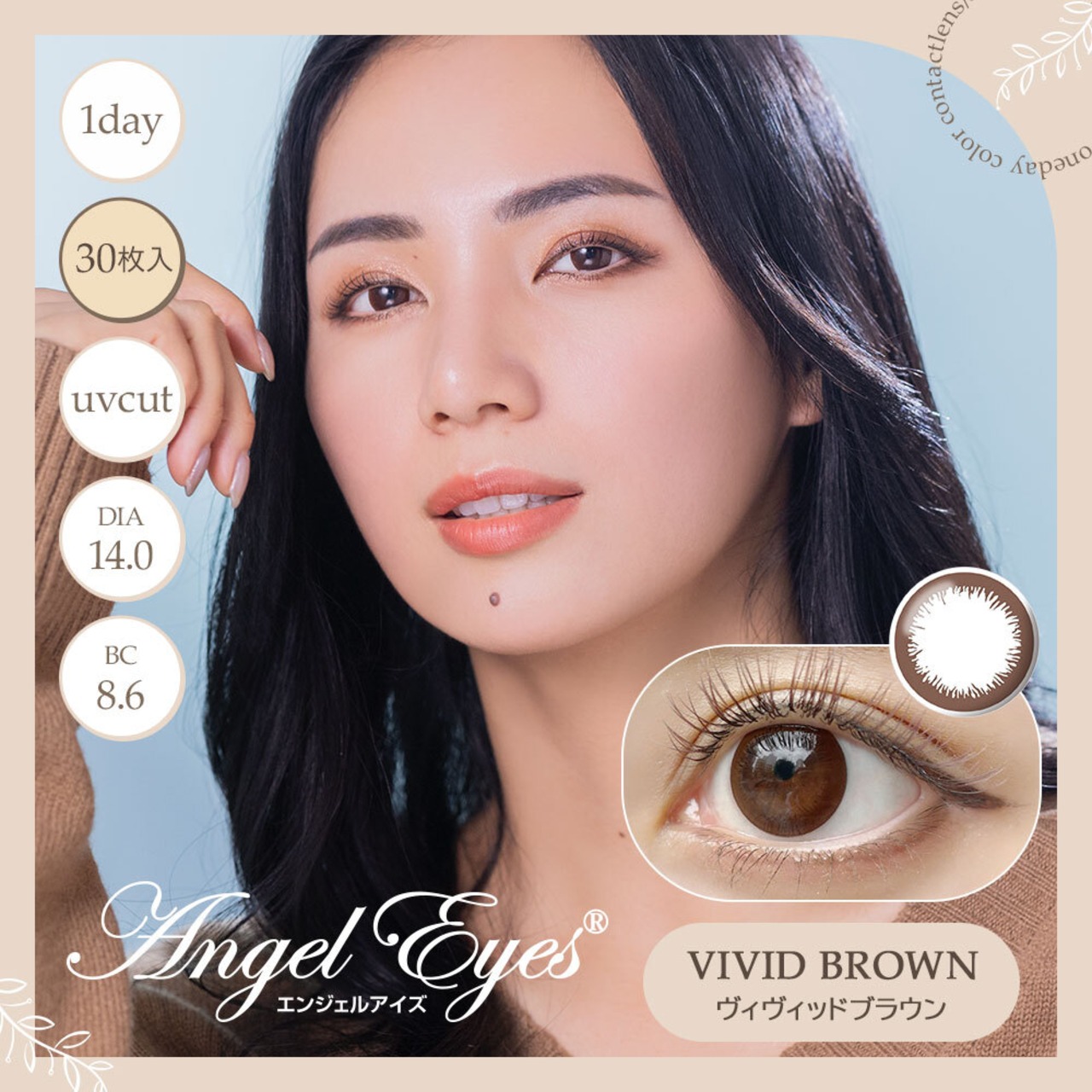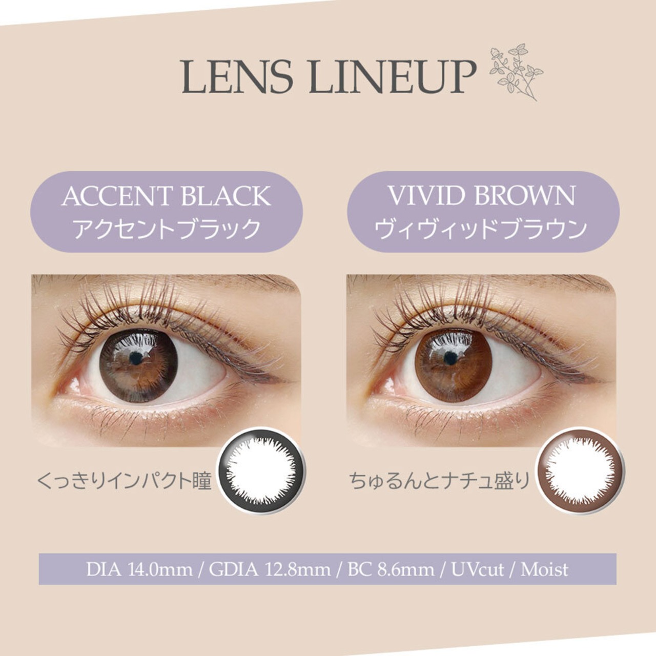 カラーは、ヴィヴィッドブラウンとアクセントブラックの2色展開。角膜やまぶたに色素が直接触れない サンドイッチ製法採用。